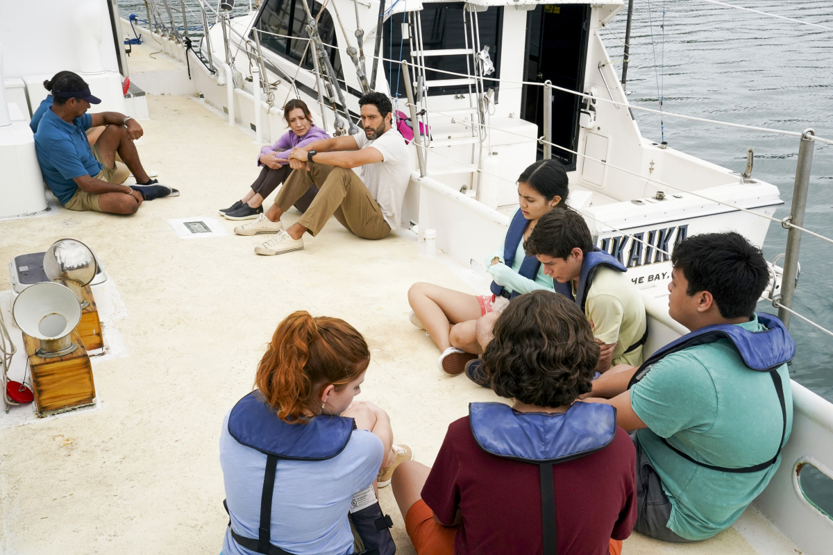 “Pirates” – As Jesse enjoys a day sailing with his daughter, Gracie (Chloe Csengery), pirates suddenly seize their yacht, take all the passengers hostage and attack Jesse, leaving it up to his team to quickly locate and rescue his daughter, on the CBS Original series NCIS: HAWAII, Monday, March 7 (10:00-11:00 PM, ET/PT) on the CBS Television Network, and available to stream live and on demand on Paramount+*. Pictured: Louise Barnes as Kaya, Noah Mills as Jesse Boone, Victor Lozano as Captain, Chloe Csengery as Gracie Boone and Nico David as Adrian Hely. Photo: Karen Neal/CBS ©2022 CBS Broadcasting, Inc. All Rights Reserved.