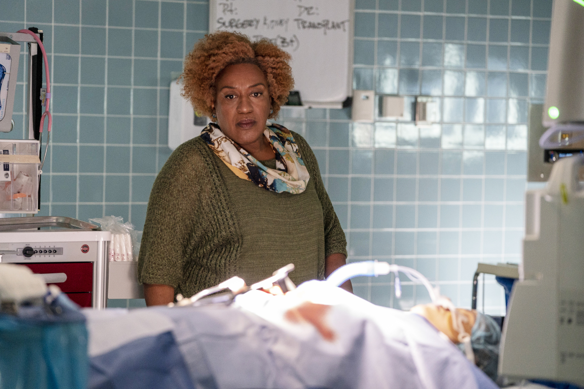 “Pound of Flesh” guest stars include Danny Burstein (Dr. Vincent Welles), Geoffrey Owens (Commander Calvin Atkins, MD), Joe Carroll (Dr. Brent Stokely), Karen Obilom (Zaire Dupre), Rebecca Haden (Dr. Susan Francis), Christina Smith (Ginny Young), Joaquin Montes (Ignacio Marquez), Nicholas Bordelon (Daniel York), Samantha Smith (Nurse), and Taneka Johnson (Receptionist).