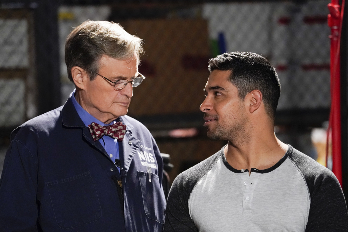 NCIS stars Mark Harmon (NCIS Special Agent Leroy Jethro Gibbs), Sean Murray (NCIS Special Agent Timothy McGee), Emily Wickersham (NCIS Special Agent Eleanor “Ellie” Bishop), Wilmer Valderrama (NCIS Special Agent Nicholas “Nick” Torres), Maria Bello (NCIS Special Agent Jaqueline “Jack” Sloane), Brian Dietzen (Dr. Jimmy Palmer), Diona Reasonover (Forensic Scientist Kasie Hines), Rocky Carroll (NCIS Director Leon Vance), and David McCallum (Dr. Donald “Ducky” Mallard).