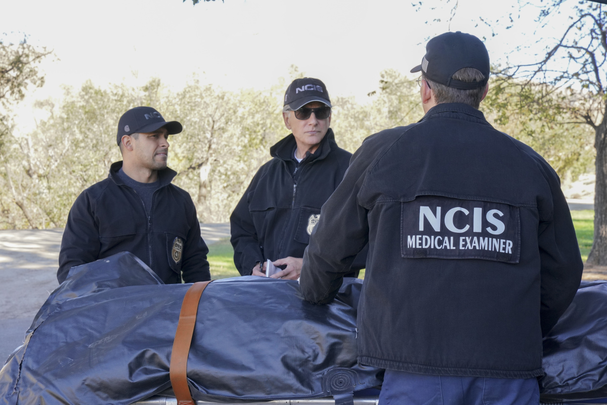 "Family Ties" -- After McGee and Torres visit the home of a high schooler who witnessed a hit and run, her parents, Christopher (Jamie Kaler) and Julie Bell (Gabrielle Carteris), flee with their daughter, leaving NCIS in the lurch. Also, Vance's daughter is arrested for shoplifting, on NCIS, Tuesday, Jan. 23 (8:00-9:00 PM, ET/PT) on the CBS Television Network. Pictured: Wilmer Valderrama, Mark Harmon, Brian Dietzen. Photo: Bill Inoshita/CBS é2017 CBS Broadcasting, Inc. All Rights Reserved