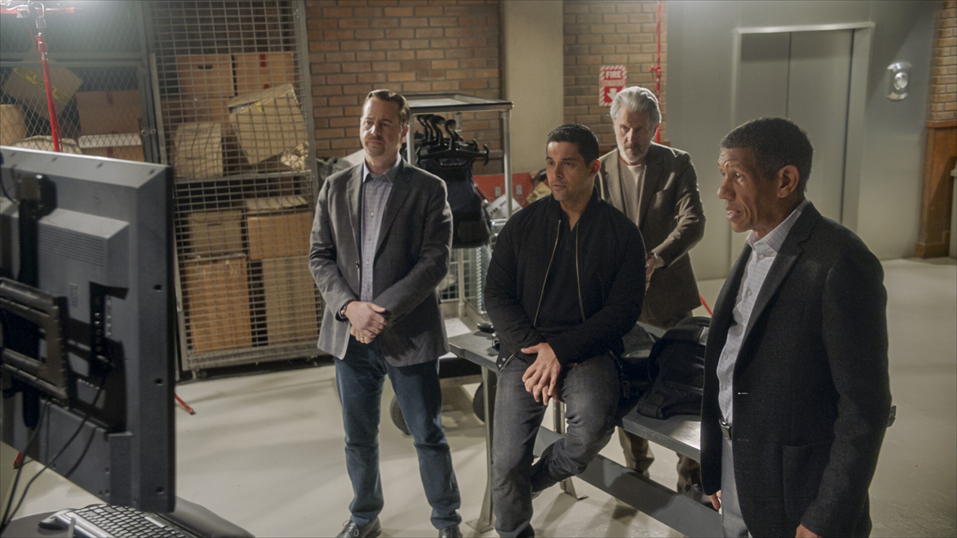 “In the Spotlight” – Agent Knight goes viral for saving a mother and child from a potentially fatal car accident, on the CBS Original series NCIS, Monday, May 1 (9:00-10:00 PM, ET/PT) on the CBS Television Network and available to stream live and on demand on Paramount+*. Series star Rocky Carroll directed the episode. Pictured: Sean Murray as Special Agent Timothy McGee, Wilmer Valderrama as Special Agent Nicholas “Nick” Torres, Gary Cole as FBI Special Agent Alden Parker, and Scott Lawrence as DEA Agent Raymond Frank. Photo: CBS ©2023 CBS Broadcasting, Inc. All Rights Reserved. Highest quality screengrab available.