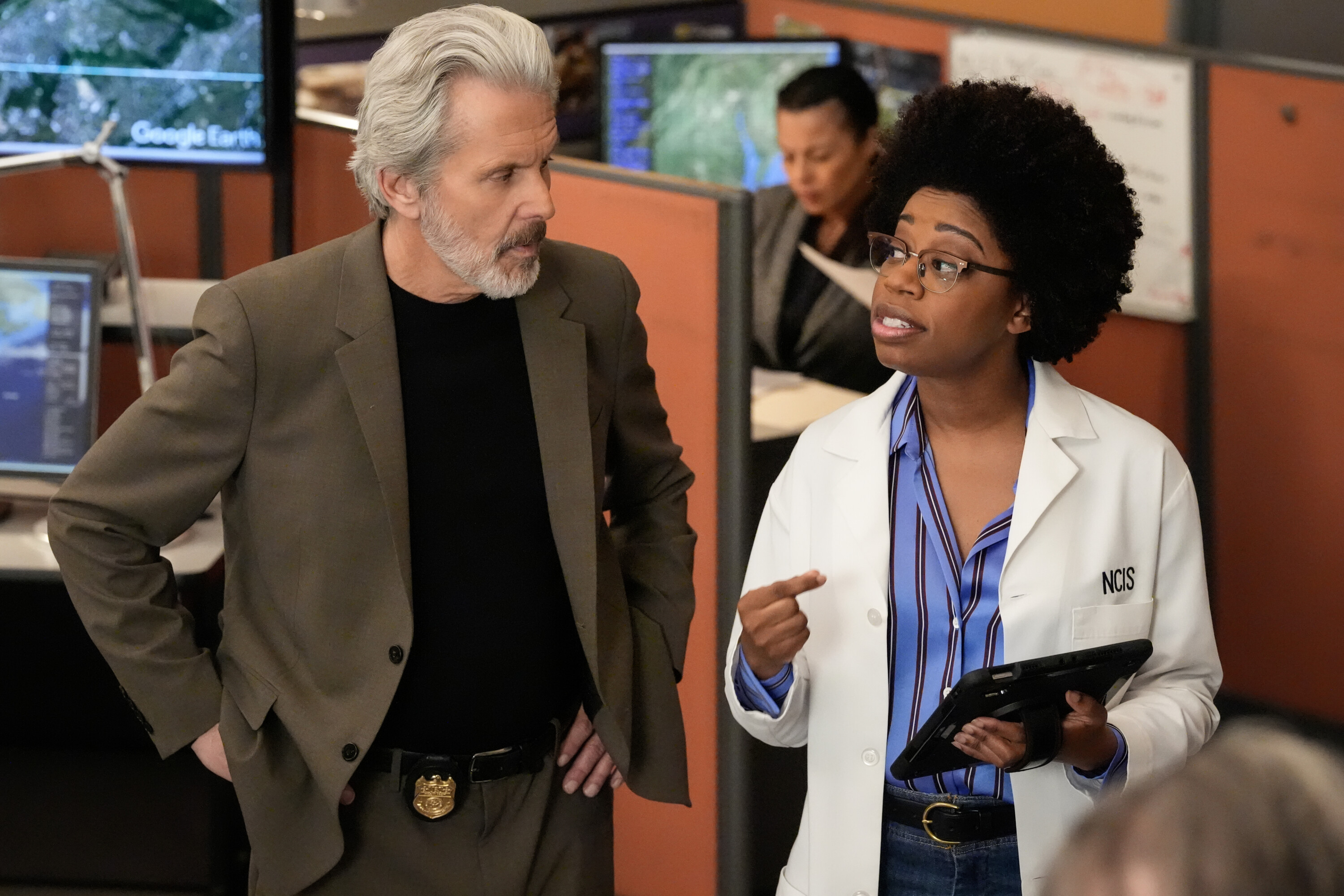“Knight and Day” – Things become tense when Knight is assigned to protect his wife after the home of a high-level defense contractor is attacked, on the CBS Original series NCIS, Monday, Nov. 25 (9:00-10:00 PM, ET/PT) on the CBS Television Network, and streaming on Paramount+ (live and on-demand for Paramount+ with SHOWTIME subscribers, or on-demand for Paramount+ Essential subscribers the day after the episode airs)*. Pictured (L-R): Gary Cole as NCIS Special Agent Alden Parker and Diona Reasonover as Forensic Scientist Kasie Hines. Photo: Robert Voets/CBS ©2024 CBS Broadcasting, Inc. All Rights Reserved.