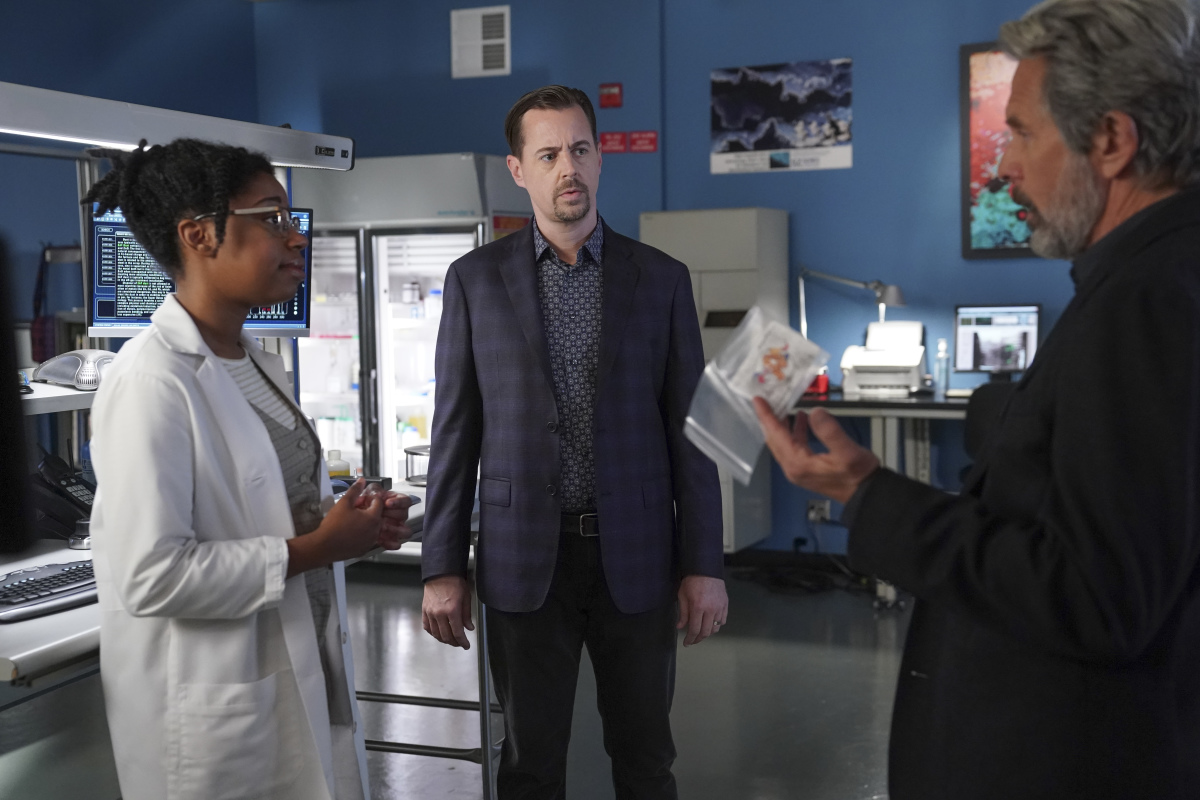 “Docked” – NCIS investigates the death of a man on a cruise ship whose body is discovered in the ship’s sauna by none other than McGee’s mother-in-law, Judy (Patricia Richardson), on the CBS Original series NCIS, Monday, Nov. 8 (9:00-10:00 PM, ET/PT) on the CBS Television Network, and available to stream live and on demand on Paramount+. Pictured: Diona Reasonover as Forensic Scientist Kasie Hines, Sean Murray as NCIS Special Agent Timothy McGee, Gary Cole as FBI Special Agent Alden Parker. Photo: Sonja Flemming/CBS ©2021 CBS Broadcasting, Inc. All Rights Reserved.
