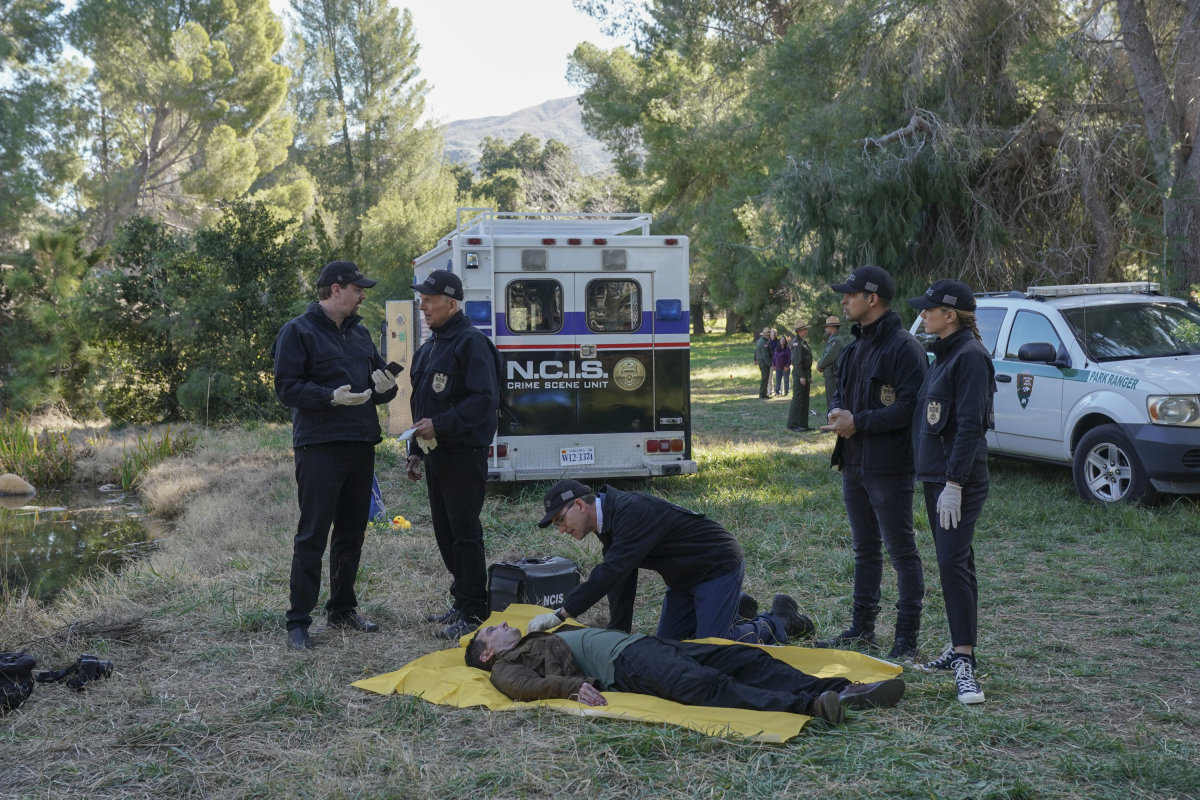 NCIS stars Mark Harmon (NCIS Special Agent Leroy Jethro Gibbs), Sean Murray (NCIS Special Agent Timothy McGee), Emily Wickersham (NCIS Special Agent Eleanor “Ellie” Bishop), Wilmer Valderrama (NCIS Special Agent Nicholas “Nick” Torres), Maria Bello (NCIS Special Agent Jaqueline “Jack” Sloane), Brian Dietzen (Medical Examiner Jimmy Palmer), Diona Reasonover (Forensic Scientist Kasie Hines), Rocky Carroll (NCIS Director Leon Vance), and David McCallum (Dr. Donald “Ducky” Mallard).
