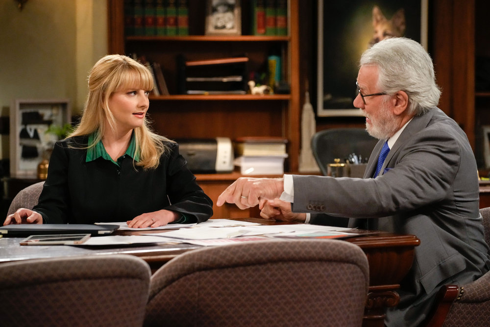 NIGHT COURT -- “DA Club” Episode 108 -- Pictured: (l-r) Melissa Rauch as Abby Stone, John Larroquette as Dan Fielding -- (Photo by: Casey Durkin/NBC)