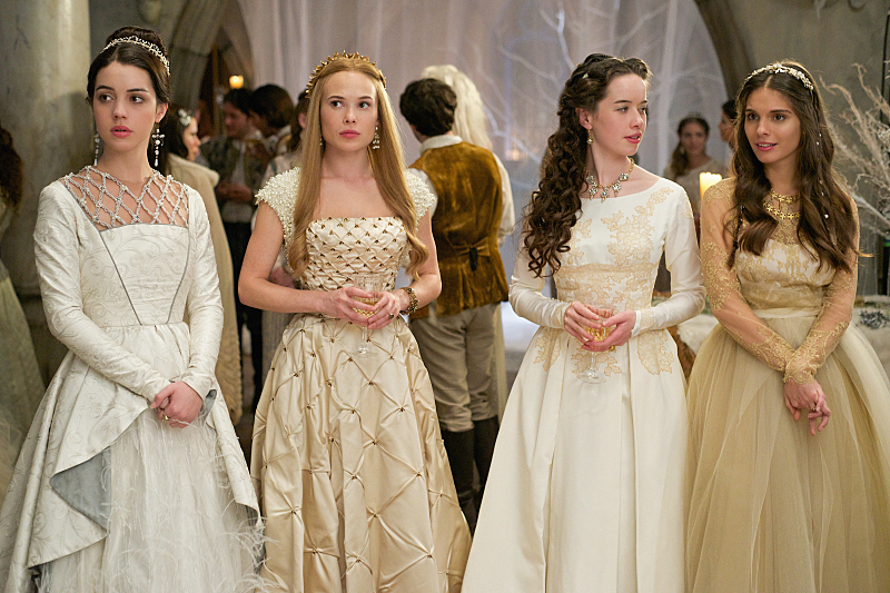Reign -- "Banished" -- Image Number: RE212a_0095.jpg -- Pictured (L-R): Adelaide Kane as Mary, Queen of Scotland and France, Celina Sinden as Greer, Anna Popplewell as Lola and Caitlin Stasey as Kenna -- Photo: Sven Frenzel/The CW -- © 2014 The CW Network, LLC. All rights reserved.