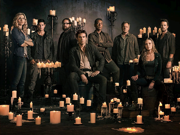 REVOLUTION -- Season: 2 -- Pictured: (l-r) Elizabeth Mitchell as Rachel Matheson, JD Pardo as Jason Neville, Zak Orth as Aaron Pittman, Billy Burke as Miles Matheson, Giancarlo Esposito as Major Tom Neville, Stephen Collins as Dr. Gene Porter, Tracy Spiridakos as Charlie Matheson, David Lyons as Gen. Sebastian Monroe -- (Photo by: Nino Munoz/NBC)