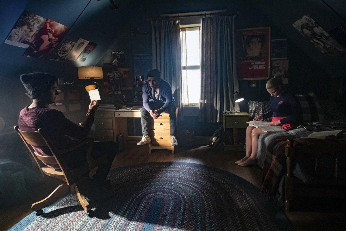 Riverdale -- "Chapter Forty-Five: The Stranger" -- Image Number: RVD310b_0218.jpg -- Pictured (L-R): Cole Sprouse as Jughead, KJ Apa as Archie and Lili Reinhart as Betty -- Photo: Jack Rowand/The CW -- © 2019 The CW Network, LLC. All rights reserved.