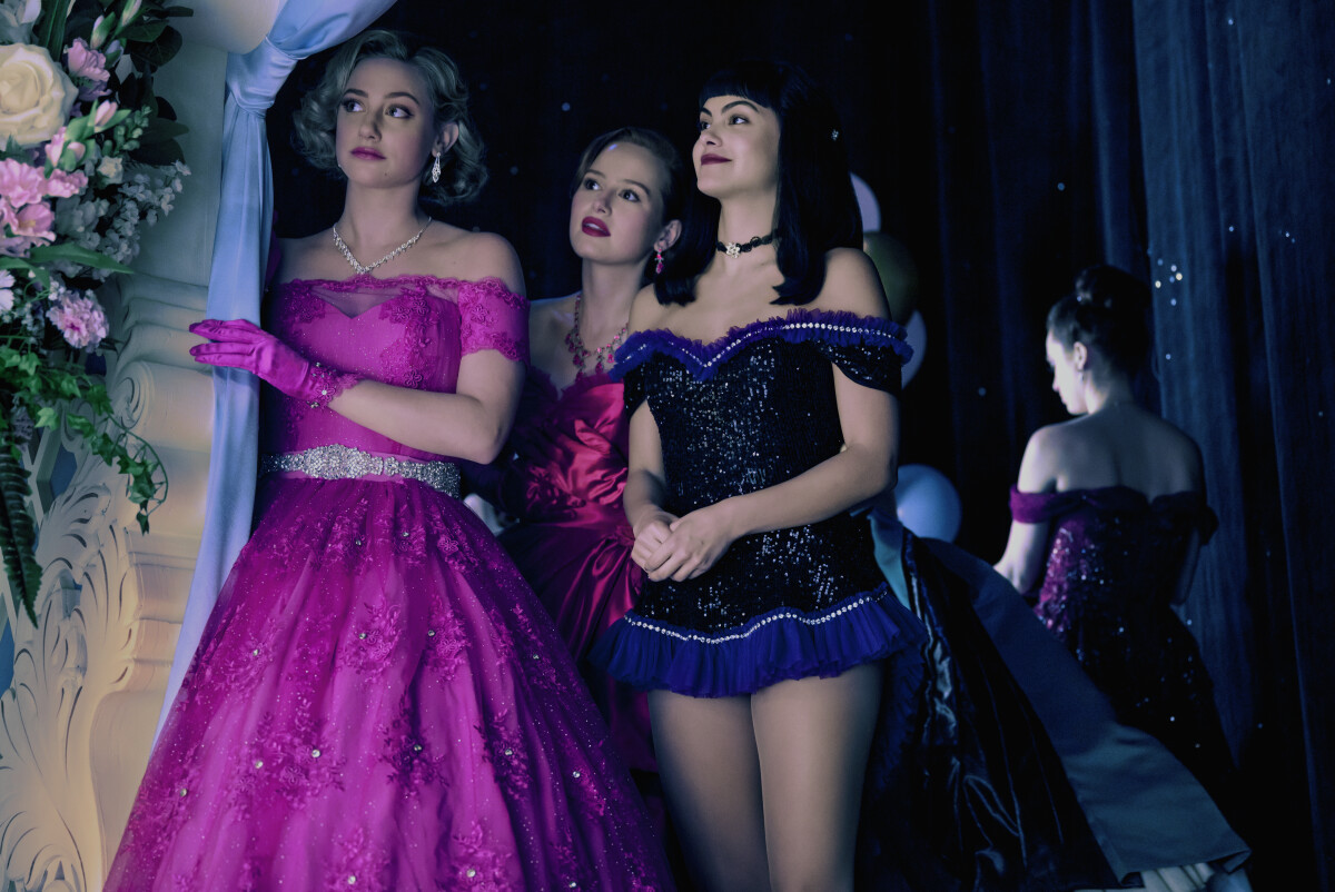Riverdale -- “Chapter One Hundred Thirty-Two: Miss Teen Riverdale” -- Image Number: RVD715a_0237r -- Pictured (L - R): Lili Reinhard as Betty Cooper, Madeleine Petsch as Cheryl Blossom, and Camila Mendes as Veronica Lodge -- Photo: Kailey Schwerman/The CW -- © 2023 The CW Network, LLC. All Rights Reserved.