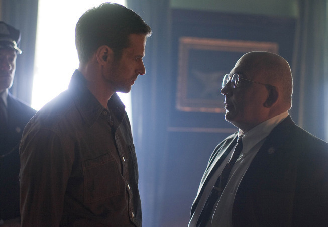 ALCATRAZ: 1960s prisoner Jack Sylvane (guest star Jeffrey Pierce, L) is summoned by Warden James (Jonny Coyne, R) in the two-hour premiere "Pilot/Ernest Cobb" episode of ALCATRAZ debuting Monday, Jan. 16 (8:00-10:00 PM ET/PT) and making its time period premiere on Monday, Jan. 23 (9:00-10:00 PM ET/PT) on FOX. ©2011 Fox Broadcasting Co. CR: James Dittiger/FOX