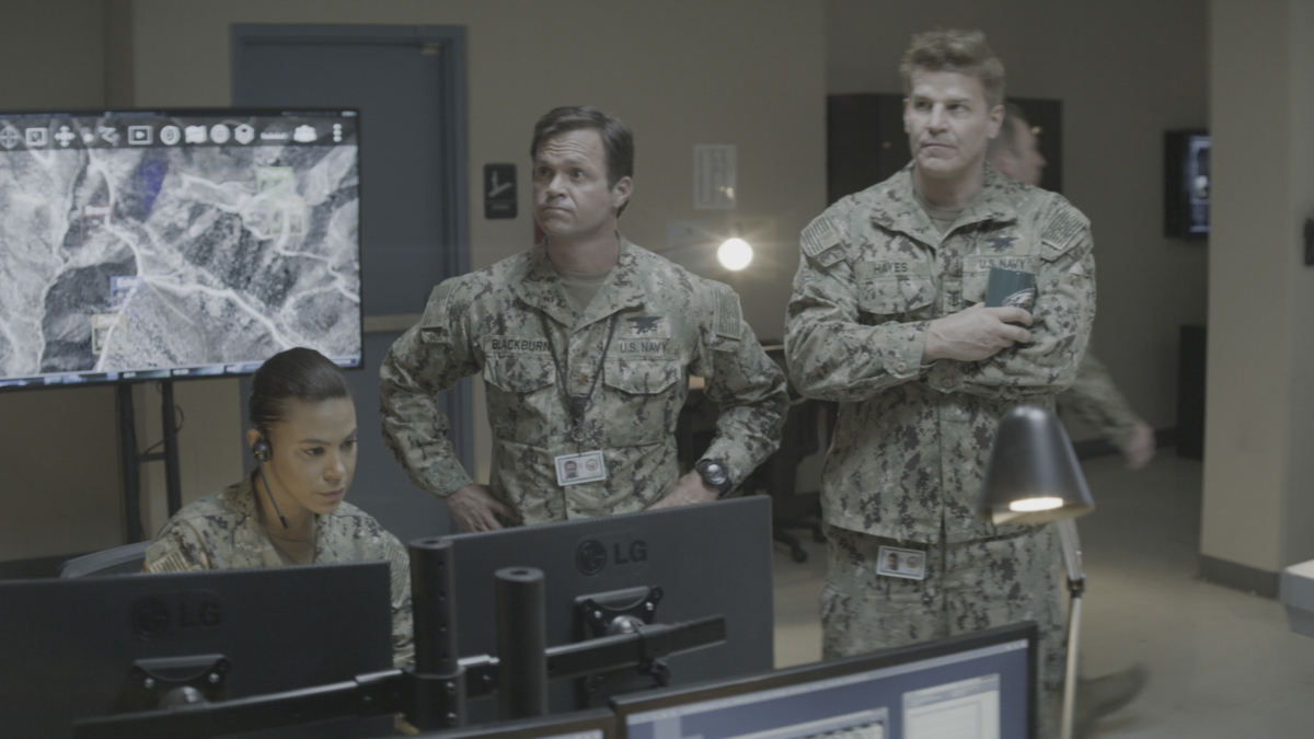 “The New Normal” – Bravo Team struggles to adjust to a new team dynamic after several members make life-altering career decisions, on SEAL TEAM, Wednesday, Dec. 9 (9:00-10:00 PM, ET/PT) on the CBS Television Network. Pictured L to R: Toni Trucks as Lisa Davis, Judd Lormand as Lt. Cdr. Eric Blackburn, and David Boreanaz as Jason Hayes. Photo: Screengrab/CBS ©2020 CBS Broadcasting, Inc. All Rights Reserved.