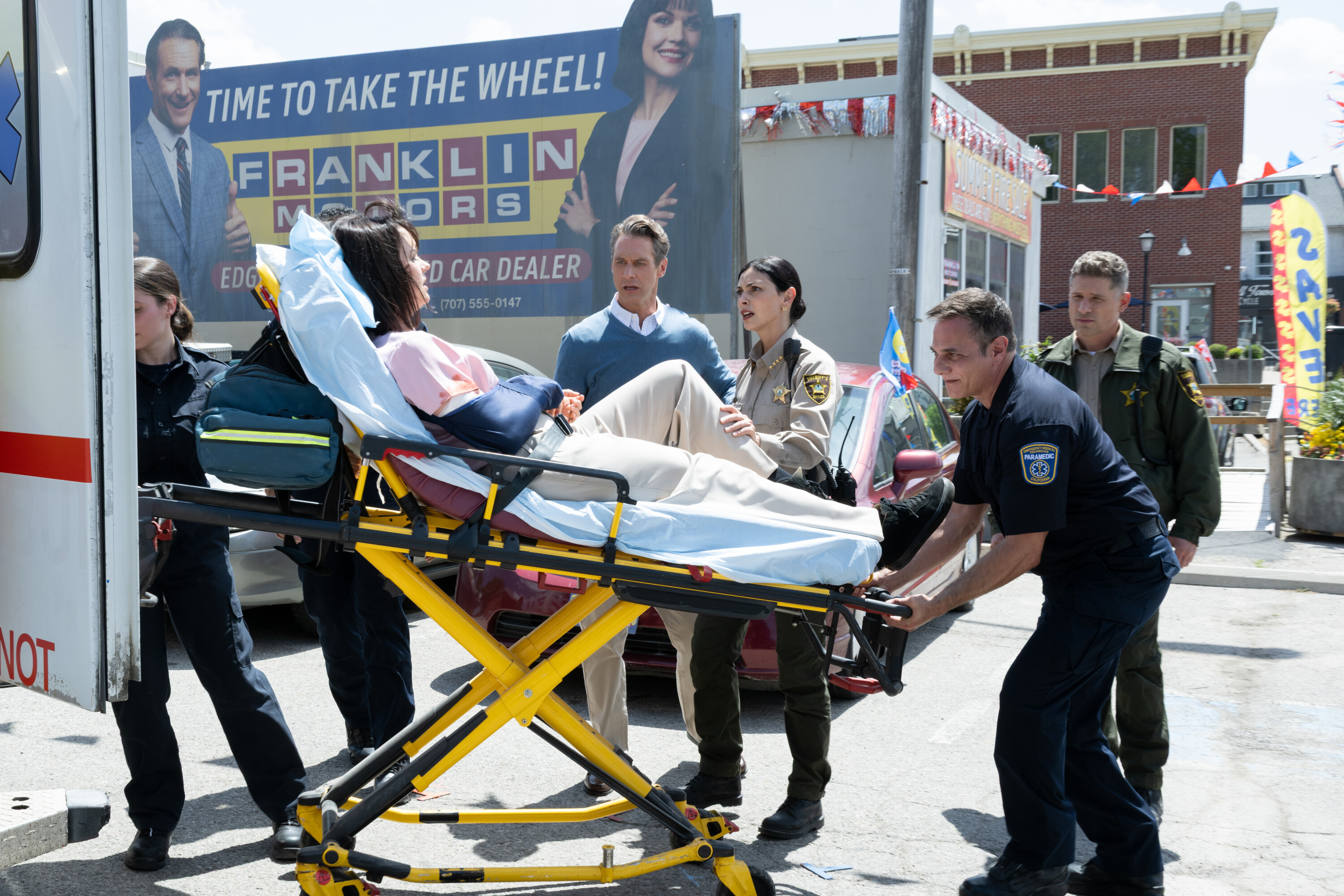 “The Sixth Man” – When a daring daylight robbery shakes the heart of Edgewater, Sheriff Mickey Fox must navigate rising tensions, personal entanglements and a town quick to judge. Meanwhile, suspicions swirl around her daughter, Skye, and her involvement in a high-profile murder case, on SHERIFF COUNTRY, Friday, Oct. 31 (8:00-9:00 PM, ET/PT) on the CBS Television Network, and streaming on Paramount+ (live and on-demand for Paramount+ Premium plan subscribers, or on-demand for Paramount+ Essential subscribers the day after the episode airs)*. Pictured: Elizabeth Whitmere as Heather Fanklin, Matt Wells as Tom Franklin, Morena Baccarin as Sheriff Mickey Fox, Daniel Fernandes as EMT and Matt Lauria as Nathan Boone. Photo: Christos Kalohoridis/CBS ©2025 CBS Broadcasting, Inc. All Rights Reserved.