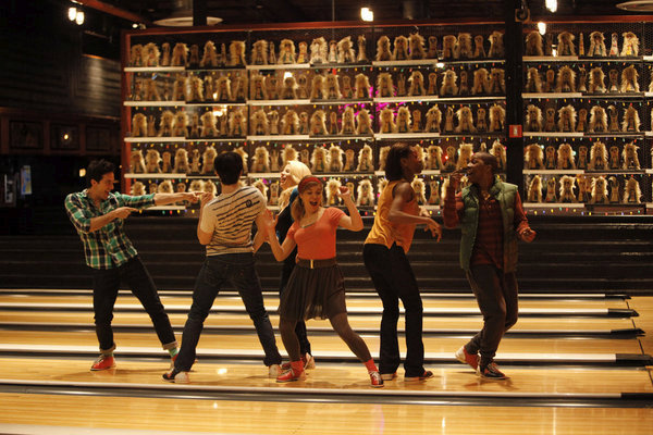 SMASH -- "The Coup" Episode 108 -- Pictured: (l-r) Phillip Spaeth as Dennis, Wesley Taylor as Bobby, Megan Hilty as Ivy Lynn, Jenny Laroche as Sue, Leslie Odom Jr. as Sam Strickland -- (Photo by: Will Hart/NBC)