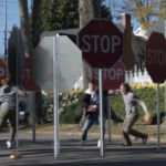 That’s a good question. They all digitally fell from the sky, but then there was there was a set amount that were in the ground for a few takes, just to have practical effects in the scene. When the Prius gets impaled by a stop sign, that was 100% real. We did that on the day. That was really fun, and all of our reactions were honestly genuine. But yeah, they tried to do as much practical effects as they possibly can., and honestly, it ended up looking really good. Tat was probably 50% of that was practical effects, and everything else they filled in the CG.