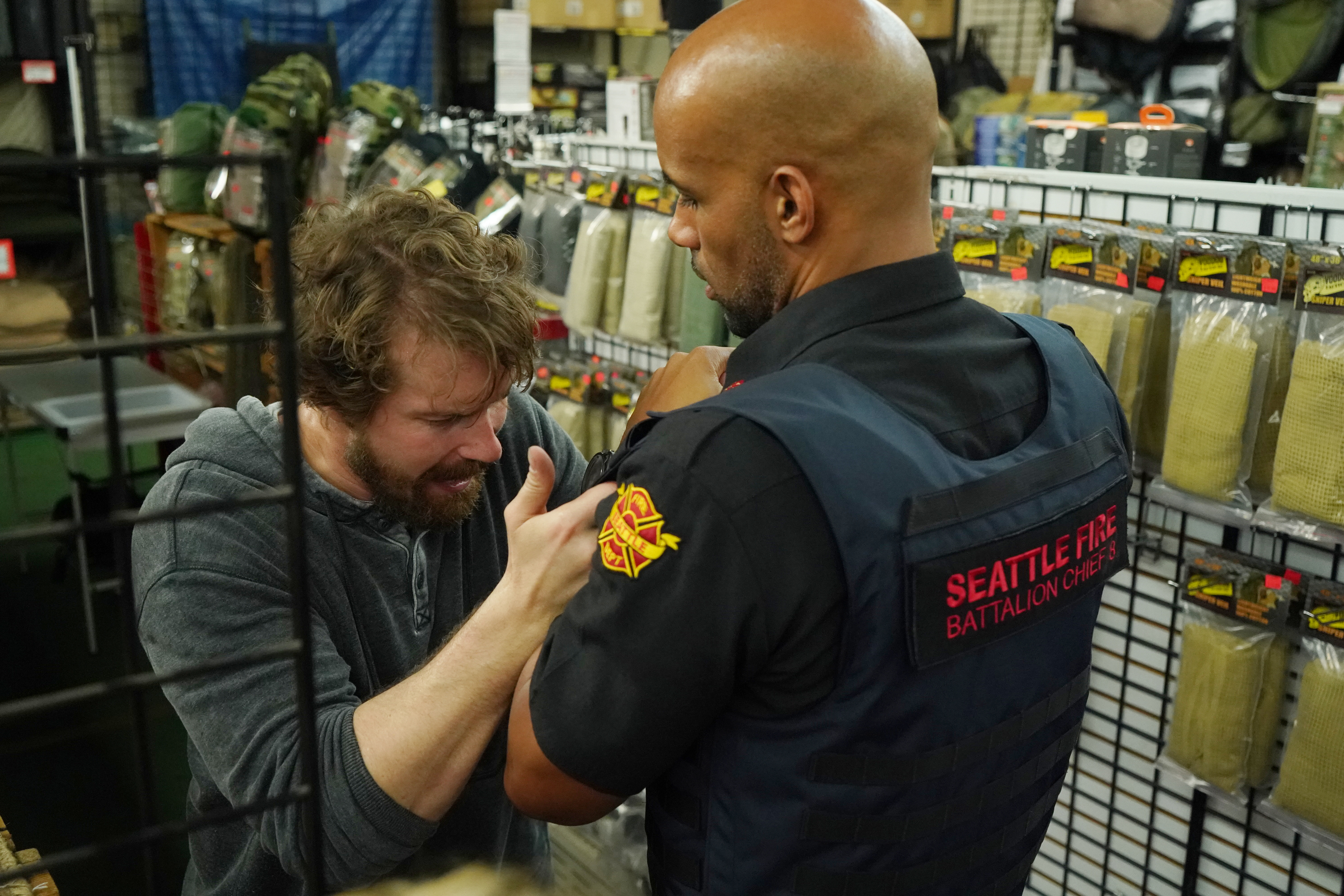 STATION 19 - "Poor Wandering One" - When an Army veteran threatens to blow up a pawn shop, Sullivan reflects on his time as a Marine to deescalate the situation. Meanwhile, Vic and Dean try to reason with a man battling Alzheimer's disease; and Pruitt takes a stand to honor fallen firefighters, on a new episode of "Station 19," airing THURSDAY, MARCH 19 (8:00-9:00 p.m. EDT), on ABC. (ABC/Richard Cartwright)JOSH KELLY, BORIS KODJOE