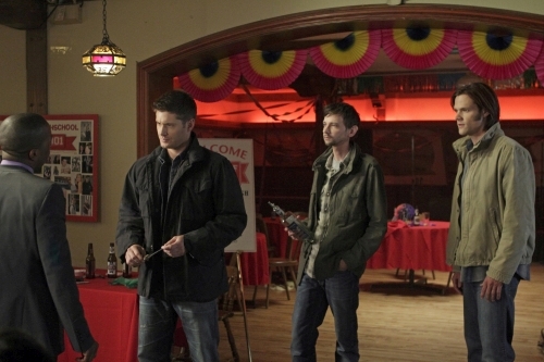 "Season 7, Time for a Wedding!" - (L-R): Leslie Odom, Jr. as Guy, Jensen Ackles as Dean, DJ Qualls as Garth, and Jared Padalecki as Sam in SUPERNATURAL on The CW.