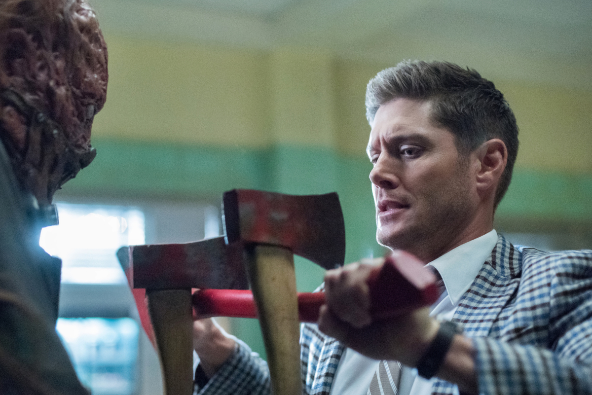 Supernatural -- "Mint Condition" -- Image Number: SN1404a_0143r.jpg -- Pictured (L-R): Barry Nerling as Hatchet Man/David Yaeger and Jensen Ackles as Dean -- Photo: Dean Buscher/The CW -- © 2018 The CW Network, LLC All Rights Reserved