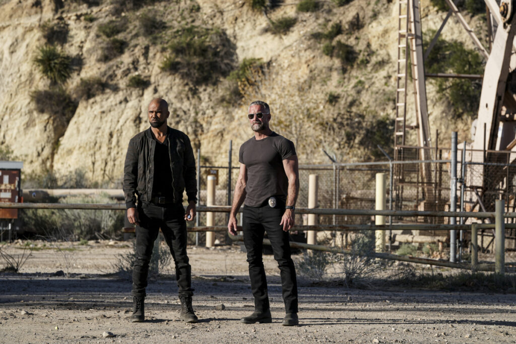 “The Fugitive” – When body cam footage left at a local news station seems to show Hondo shooting two police officers, he is forced to go on the run while the team works to clear his name, on the 100th episode of the CBS Original series S.W.A.T., Sunday, April 10 (10:00-11:00 PM, ET/PT) on the CBS Television Network, and available to stream live and on demand on Paramount+*. Pictured (L-R): Shemar Moore as Daniel “Hondo” Harrelson and Jay Harrington as David “Deacon” Kay. Photo: Sonja Flemming/CBS ©2022 CBS Broadcasting, Inc. All Rights Reserved.