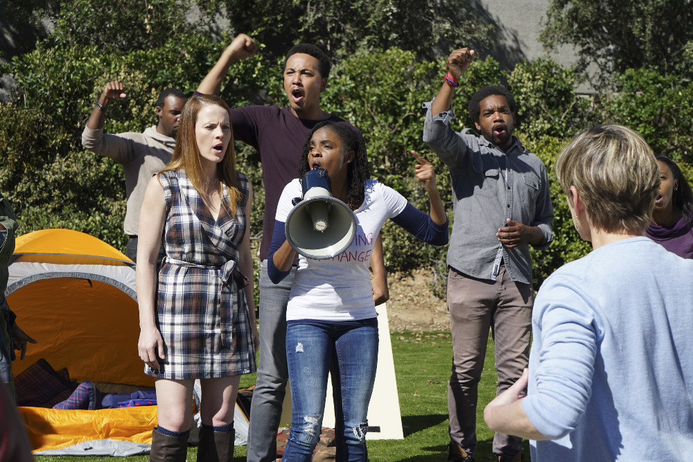 In the episode, Daphne and Sharee are horrified to stumble upon a racist display at the Black Student Union on campus. When the perpetrators are given minimal punishment, Iris starts a hunger strike in protest. Daphne receives an anonymous threat and Sharee grows frustrated with how the school is handling the situation. Also, Emmett invites Bay to help him with an art project, causing friction with Travis who’s already upset that John seems ready to replace him on the baseball team.