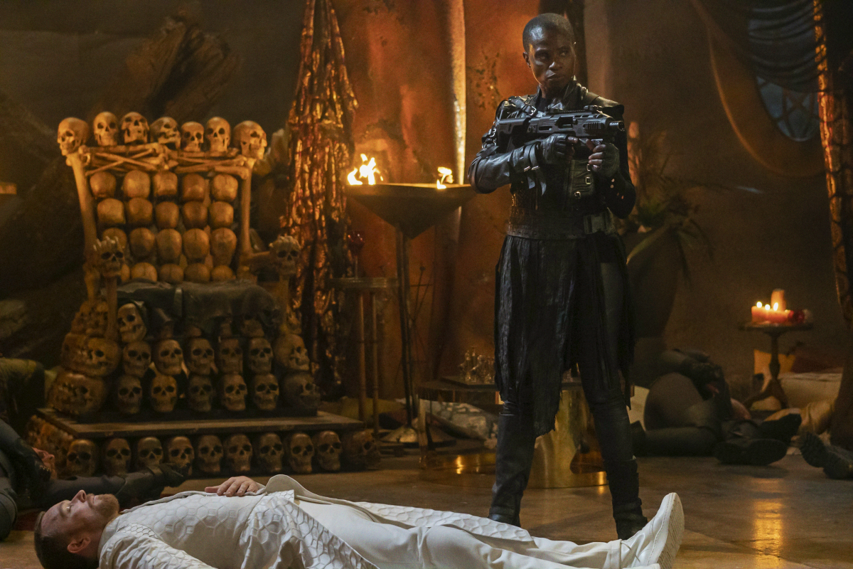 The 100 -- "Blood Giant" -- Image Number: HU711A_1153r.jpg -- Pictured (L-R): Jonathan Scarfe as Conductor Doucette and Adina Porter as Indra -- Photo: Colin Bentley/The CW -- 2020 The CW Network, LLC. All rights reserved.