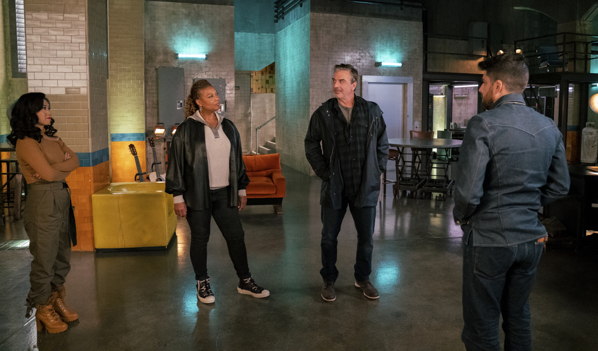 “When Worlds Collide” – Bishop comes to McCall, Harry and Mel for help when a terrorist from his past uncovers the identity of his adult son, a young man Bishop has kept secret for decades to safeguard him from his intelligence work. Also, Aunt Vi becomes nostalgic about a past romantic relationship when she receives a surprise visitor, on the CBS Original series THE EQUALIZER, Sunday, Nov. 28 (9:00-10:00 PM, ET/PT) on the CBS Television Network, and available to stream live and on demand on Paramount+*.Pictured (L-R): Liza Lapira as Melody “Mel” Bayani, Queen Latifah as Robyn McCall, Chris Noth as William Bishop, and Adam Goldberg as Harry Keshegian. Photo: Michael Greenberg/CBS ©2021 CBS Broadcasting, Inc. All Rights Reserved.