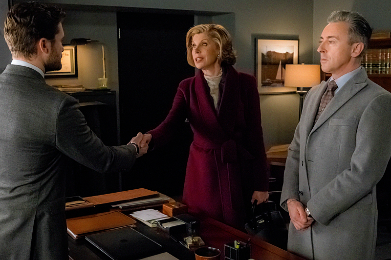 "Unmanned" -- Alicia and Diane defend the privacy rights of a therapist whose neighbor, represented by attorney Caitlyn D'Arcy (Anna Camp), flies a drone over his home office. Also, Assistant U.S. Attorney Connor Fox (Matthew Morrison) attempts to use Eli's daughter, Marissa, as leverage in the case against Peter, and the power struggle at Lockhart, Agos & Lee reaches a boiling point, on THE GOOD WIFE, Sunday, March 27 (9:00-10:00 PM, ET/PT) on the CBS Television Network. Pictured (l-r) Matthew Morrison as AUSA Connor Fox, Christine Baranski as Diane Lockhart and Alan Cumming as Eli Gold Photo: Jeff Neumann/CBS é2016 CBS Broadcasting, Inc. All Rights Reserved