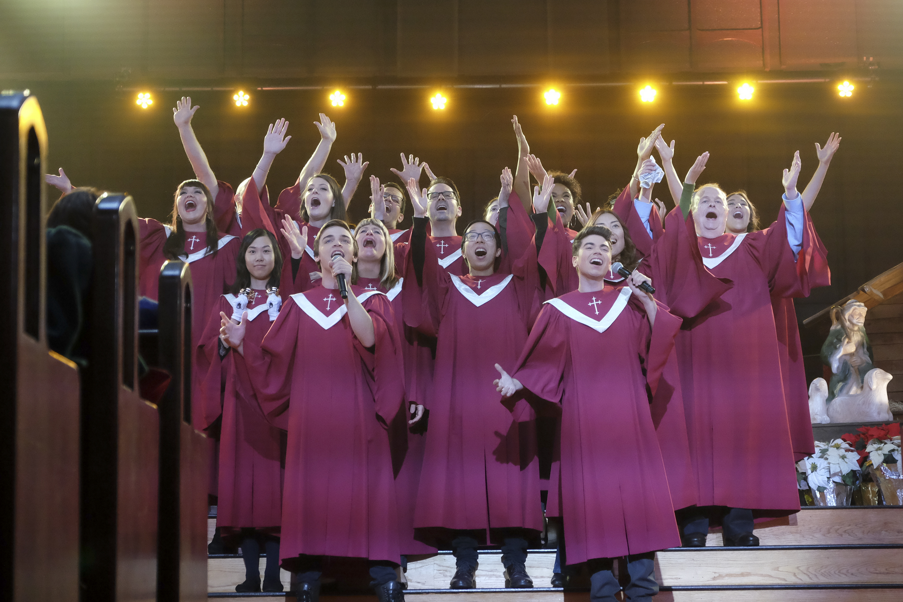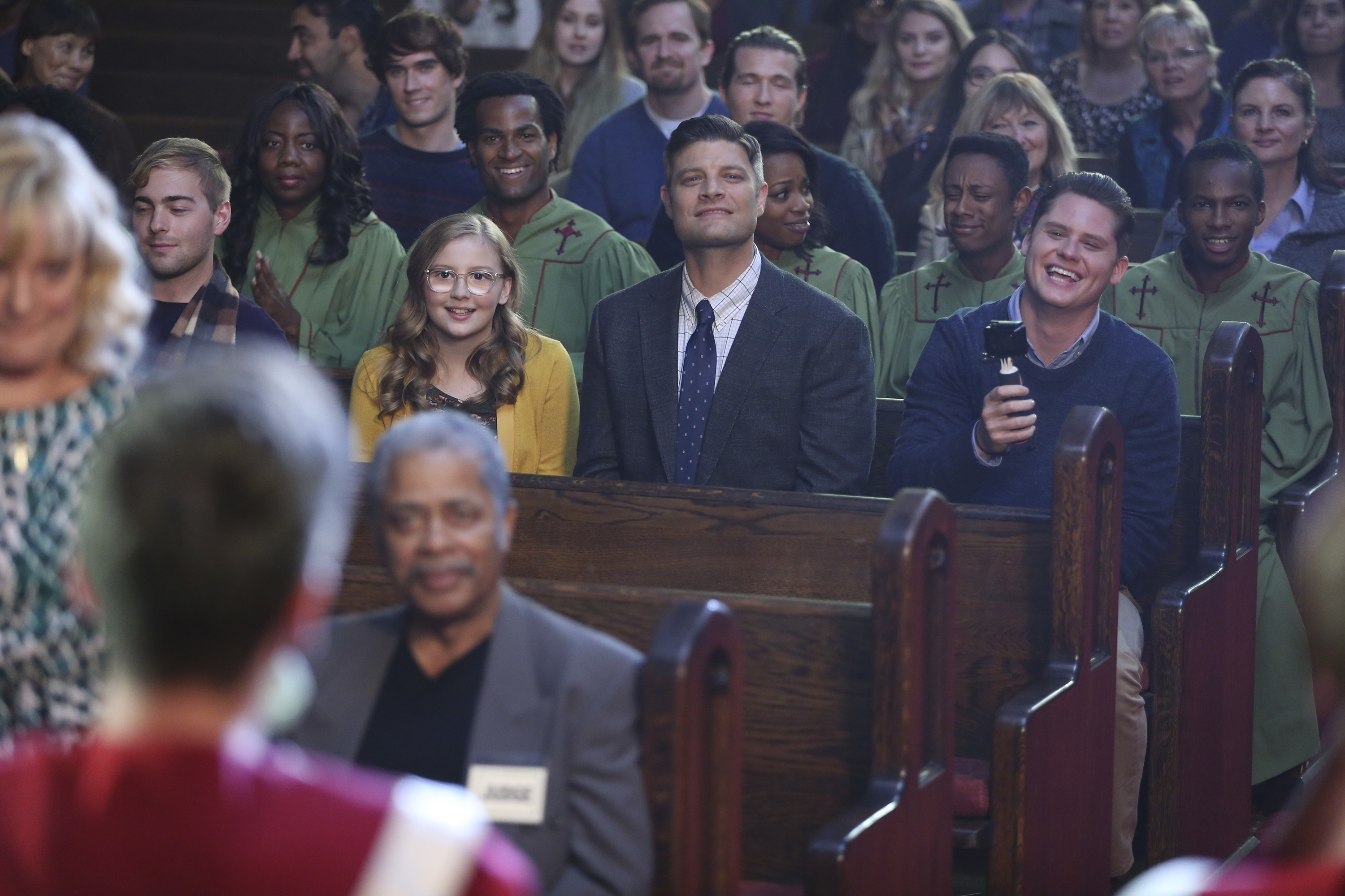 THE REAL O'NEALS - "The Real Christmas" - Eileen will stop at nothing to win the Christmas Choir competition and gives the coveted Christmas Choir solo to their newest member Brett (Sean Grandillo), to Kenny's dismay, while Jimmy is tasked with spying on their toughest competitor, Sheila Demars (Angela Kinsey). But, when Kenny attempts to sabotage Brett's role, he finds a potential love interest. Meanwhile, Shannon accidentally gives Pat the wrong impression about a Christmas present she plans on giving to Ethan, on "The Real O'Neals," airing TUESDAY, DECEMBER 13 (9:30-10:00 p.m. EDT), on the ABC Television Network. (ABC/John Fleenor)MARY HOLLIS INBODEN, RAMONA YOUNG, SEAN GRANDILLO, NOAH GALVIN