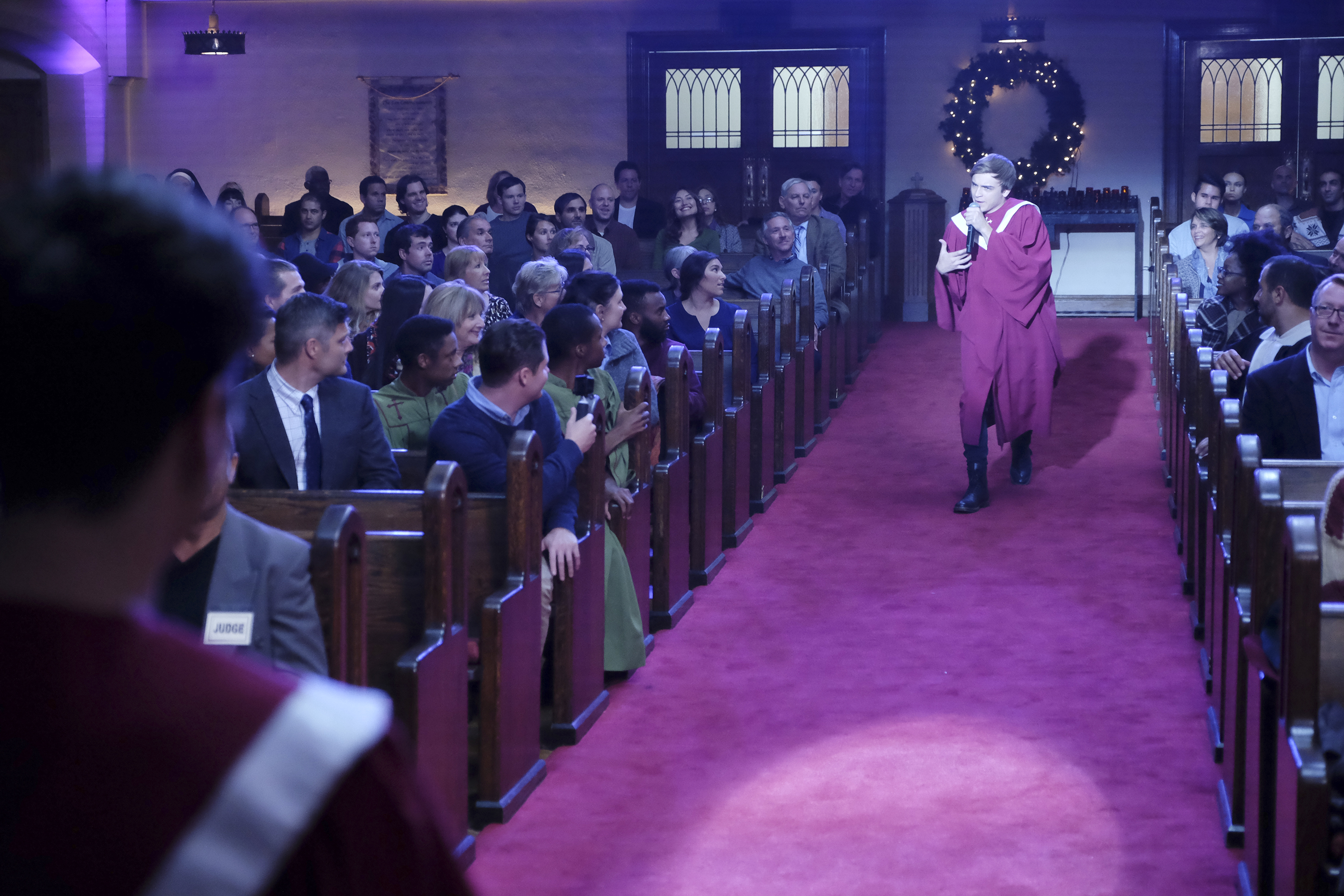 THE REAL O'NEALS - "The Real Christmas" - Eileen will stop at nothing to win the Christmas Choir competition and gives the coveted Christmas Choir solo to their newest member Brett (Sean Grandillo), to Kenny's dismay, while Jimmy is tasked with spying on their toughest competitor, Sheila Demars (Angela Kinsey).  But, when Kenny attempts to sabotage Brett's role, he finds a potential love interest. Meanwhile, Shannon accidentally gives Pat the wrong impression about a Christmas present she plans on giving to Ethan, on "The Real O'Neals," airing TUESDAY, DECEMBER 13 (9:30-10:00 p.m. EDT), on the ABC Television Network. (ABC/John Fleenor)SEAN GRANDILLO