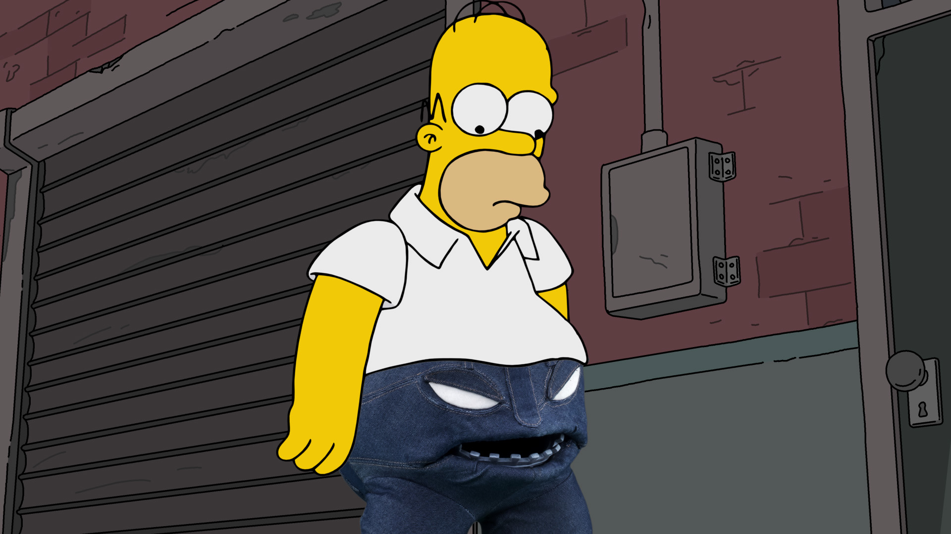 Giant monsters created by political rage threaten to tear the town apart, a Victorian Mr. Burns is jump-scared on Thanksgiving by the ghosts of his abused workers, and Homer bonds with a pair of extra-terrestrial jeans in an unforgettable stop-motion adventure that can only be called… Denim in the all-new “Treehouse of Horror XXXV” episode of The Simpsons airing Sunday, Nov 3 (8:00-8:30 PM ET/PT) on FOX. (SI-3513) (TV-14 D,L,S,V)