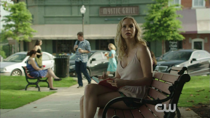 Thanks to Mr. Video, we have screen captures from a preview clip featuring the “Steroline” coupling of Caroline (Candice Accola) and Stefan (Paul Wesley). In the clip, Caroline is writing in the diary for Elena on the bench dedicated to her mother’s memory and Stefan visits.