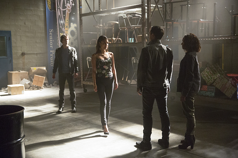 The Vampire Diaries -- "You Decided That I Was Worth Saving" --Image Number: VD803a_0292.jpg -- Pictured (L-R): Ian Somerhalder as Damon, Nathalie Kelley as Sybil, Michael Malarkey as Enzo and Kat Graham as Bonnie -- Photo: Bob Mahoney/The CW -- © 2016 The CW Network, LLC. All rights reserved.