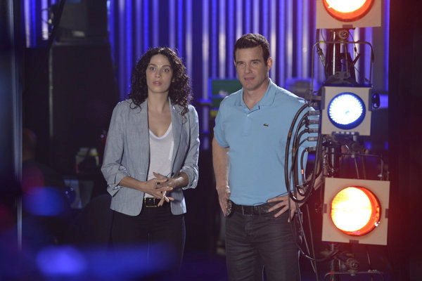 WAREHOUSE 13 -- "The Sky's The Limit" Episode 414 -- Pictured: (l-r) Joanne Kelly as Myka Bering, Pete Lattimer as eddie McClintock -- (Photo by: Steve Wilkie/Syfy)
