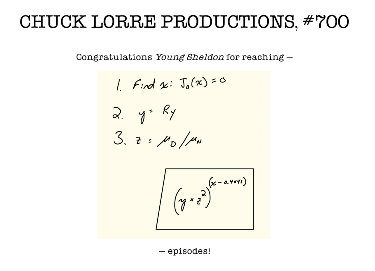 Following tonight’s landmark 100th episode of Young Sheldon, Chuck Lorre dropped his 700th vanity card, appropriately congratulating Young Sheldon on reaching #100. A half hour later, United States of Al featured another Lorre vanity card, the 701st, this time poking fun at the 700th vanity card.