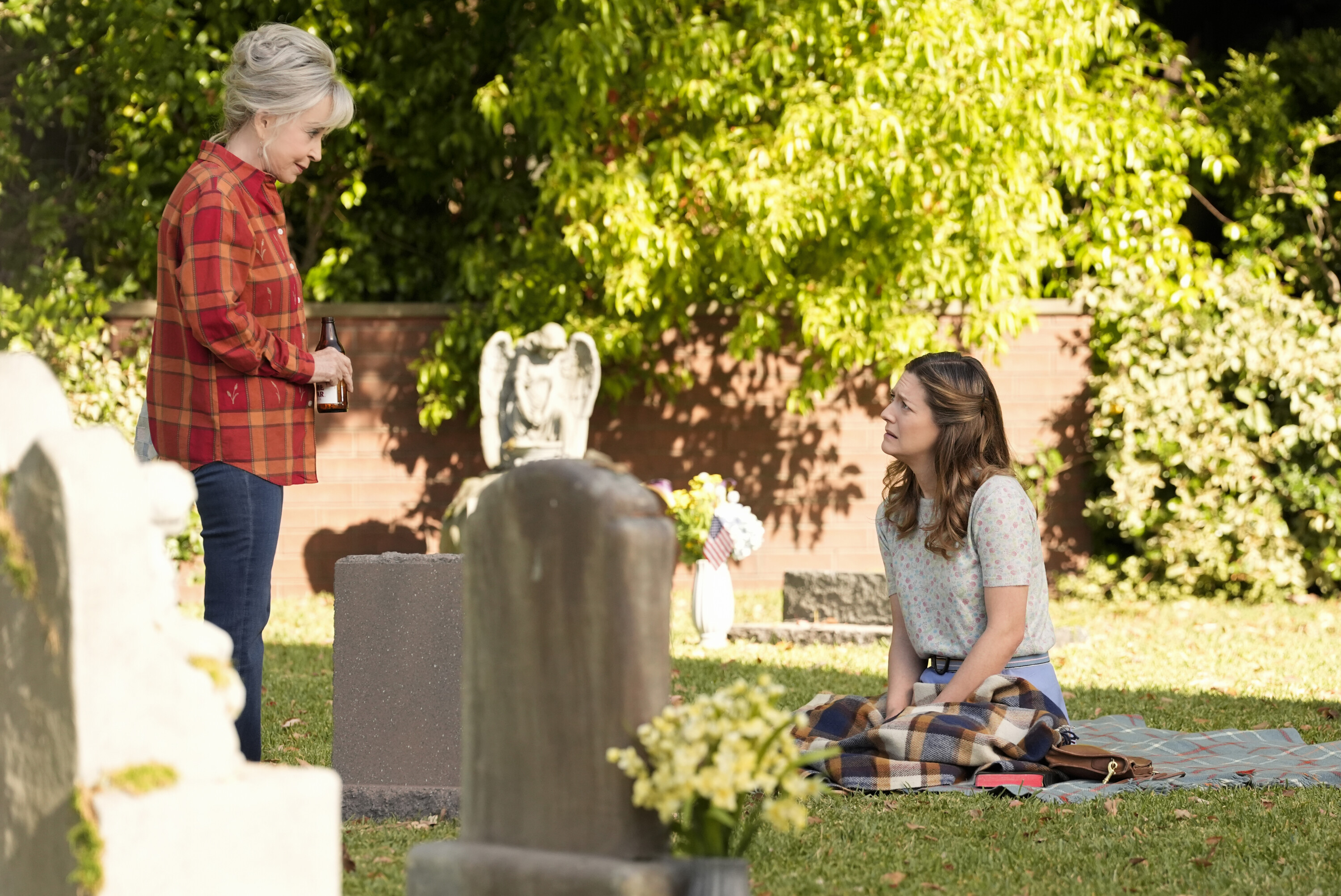 “Funeral” and “Memoir” – YOUNG SHELDON ends its seven-year run with a must-see two-episode series finale. Jim Parsons and Mayim Bialik reprise their roles as Sheldon Cooper and Amy Farrah Fowler in an unforgettable hour of television, on the series finale of YOUNG SHELDON, Thursday, May 16 (8:00-8:30 PM, ET/PT and 8:30-9:00 PM, ET/PT) on the CBS Television Network, and streaming on Paramount+ (live and on-demand for Paramount+ with SHOWTIME subscribers, or on-demand for Paramount+ Essential subscribers the day after the episode airs)*. Pictured (L-R): Annie Potts as Meemaw and Zoe Perry as Mary Photo credit: Robert Voets/2024 Warner Bros. Entertainment Inc. All Rights Reserved.